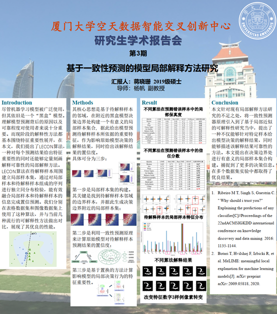 2022年5月31日上午,厦门大学空天数据智能交叉创新中心召开第3期研究生学术报告会。本期报告会由学生自主担任程序委员会主席,由航天航天学院王颖、洪文兴、余臻、曾念寅、刘利军、缪克华、周绮凤、杨帆、关锦婷等研究生导师出席,并总结点评。