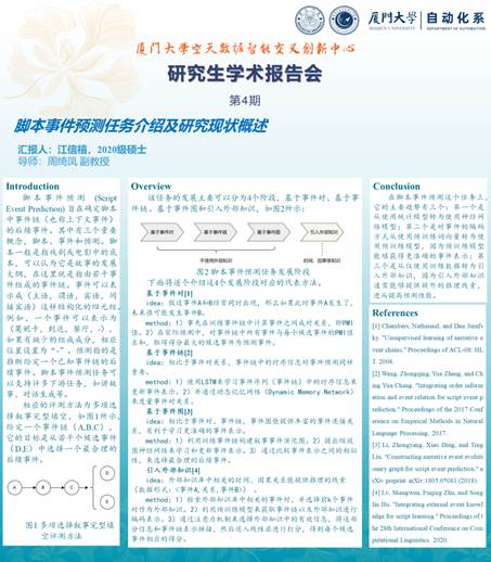 脚本事件预测任务是对结构化事件的演化推理,可以支持许多下游任务,比如讲故事,对话生成等。相比于问答、常识推理等经典的自然语言处理任务,脚本事件预测任务并不被广泛关注。因此,为了让大家快速了解该任务,本次汇报首先介绍脚本事件预测任务的定义、基本概念和相应的评测方法,然后概述其发展过程中的4个重要阶段中的代表方法,最后总结目前研究方法中的3个主要趋势。