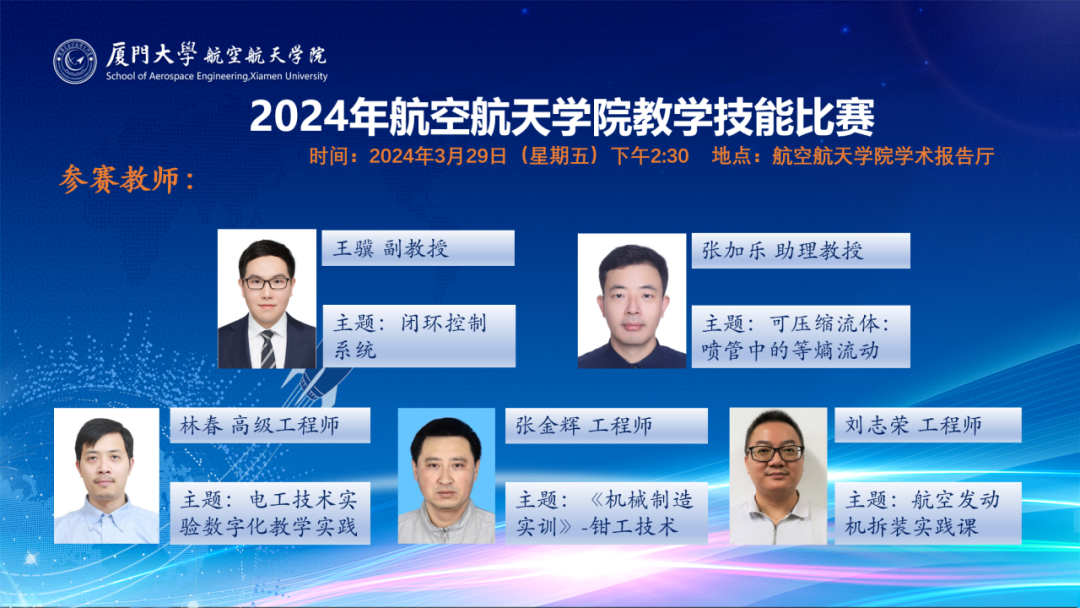 为更好落实立德树人根本任务,切实提升我院教师的教学技能,在院工会和教学支撑中心的共同组织下,航空航天学院第十九届教师教学技能比赛于3月29日下午在院楼报告厅顺利举行。我系王骥老师荣获院教学比赛一等奖。
