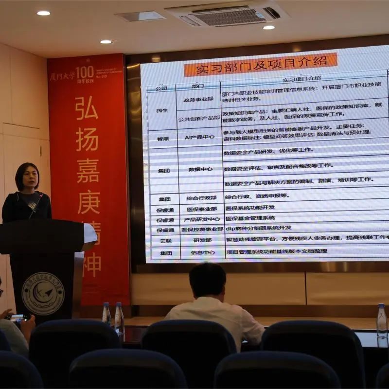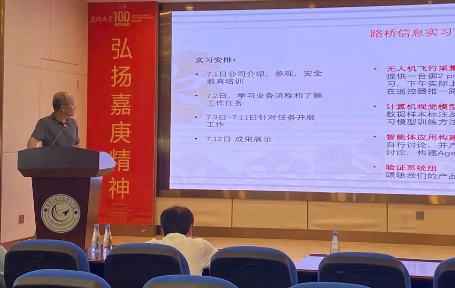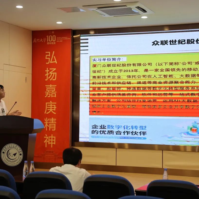 表彰先进,也是为了激励后来者。本次会议随后面向2021级本科生开展了生产实习第一节课。各位带队老师轮流介绍生产实习单位的情况、具体安排及安全事项。首先,洪文兴老师介绍了北京控制工程研究所(502所),该所是集研究、开发、设计、制造、试验与一体的综合性高科技研究所,在国内空间飞行器控制领域处于主导地位。曹浪财老师将带队赴航空工业直升机设计研究所实习,进行飞行器动力学、机械结构、航路规划等方面能力的培养。周绮凤老师介绍了易联众信息技术股份有限公司实习项目,该公司坚持以数据链为基础,重点围绕人力资源和社会保障、医疗保障、卫生健康等民生领域,致力于以数字化重塑民生健康新生态。杨帆老师对厦门众联世纪股份有限公司的实习安排进行介绍,该公司依托在人工智能、大数据等领域的前沿技术,为行业客户提供涵盖咨询、软件和运营等一站式数字化转型解决方案。彭洪老师介绍了厦门路桥信息股份有限公司及厦门天卫科技有限公司的实习项目,旨在培养学生关于遥感信息采集、计算机视觉与数字图像处理的能力。