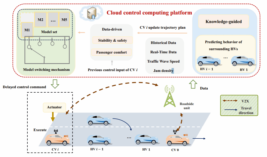 随着自动驾驶的快速发展,现代交通系统即将迎来不同等级的自动驾驶汽车与传统人类驾驶汽车长期共存的混合交通发展阶段。然而,传统人类驾驶汽车受人类驾驶行为影响,其行为具有高度不可预测性,直接影响混合交通流的稳定性与运行效率。此外,C-V2X无线通信固有的随机时延和数据丢包等特征会显著降低智能网联汽车的控制精度,导致车速匹配偏差或车距失控。这些问题叠加导致混合车辆队列的道路通行能力、能耗效率与行驶安全性难以协同提升,成为制约网联自动驾驶系统从技术研发走向实际落地的瓶颈。
