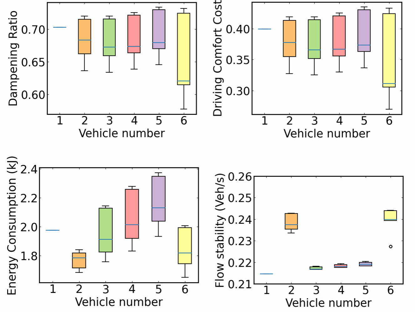 受网络条件波动与环境干扰影响,各阶段通信时延具有随机性,这种随机性会显著影响控制模型性能。为解决这一问题,提出控制模型切换机制。在状态维度相同的前提下,优先选择与检测到的时延值最匹配的模型,确保控制模型在随机时延环境下仍能保持最优性能,实现对随机干扰的鲁棒性。此外,在随机时延下进行 100 次实验,所有评价指标均仅存在小幅波动,且 6号网联自动驾驶车辆的指标中位数优于其前方传统车辆(3~5号车),验证了所提方法对随机时延的鲁棒性。