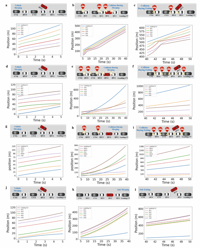 图4. 人类驾驶汽车存在换道行为时混合车辆队列的位置响应曲线 (a-c为CVDS-IDM控制的响应曲线;d-f 为DDPG控制的响应曲线;g-i 为PPO控制的响应曲线;j-l为本文提出控制构架的响应曲线。
