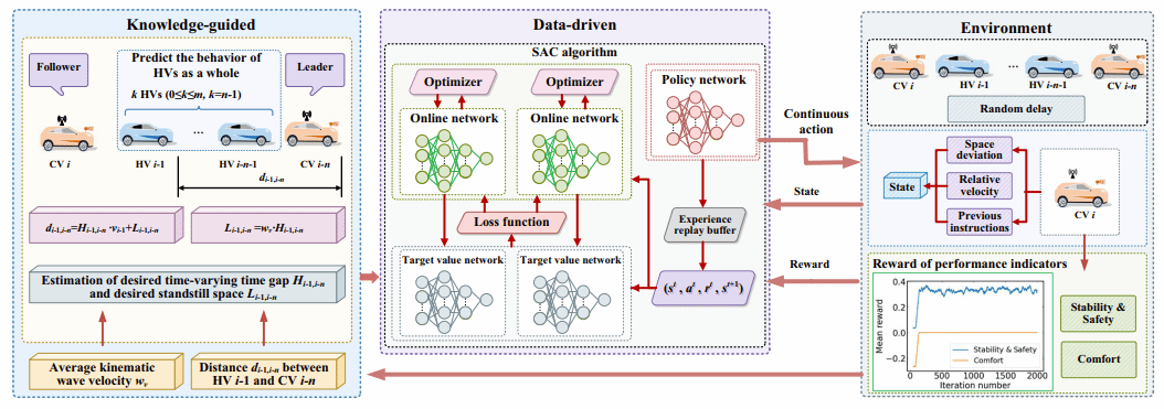 团队创新性地构建知识-机器学习集成形式,利用运动波模型与Newell跟驰模型的物理模型知识,将提取的交通特征和多车通信拓扑结构融入混合车辆队列的自学习控制过程,提升了模型的泛化能力、可解释性和可信度。针对通信时延难题,团队扩展SAC的状态表征维度,将历史时刻的控制指令纳入SAC算法的状态表示中,补偿时延对当前状态的影响;建立动态控制模型切换机制,通过时间戳实时检测时延,将时延划分为多个区间并匹配对应控制模型,实现随机通信时延下混合车辆队列的强鲁棒、高可靠控制。