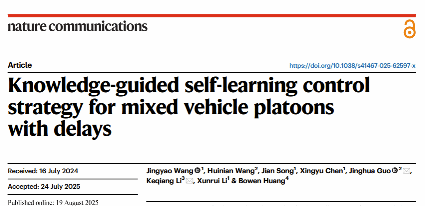 近日,我院空天无人系统研究团队自动化系副主任王靖瑶副教授在多智能体系统与网联自动驾驶领域取得关键突破。网联自动驾驶作为多智能体系统的典型应用,创新性地提出通信延迟下知识引导型自学习混合车辆队列控制框架,该框架为网联自动驾驶系统的发展和推广提供了一种可扩展、通用的解决方案。国际顶级综合期刊《Nature Communications》 于2025年8月19日报道了这项研究成果《Knowledge-guided self-learning control strategy for mixed vehicle platoons with delays》。