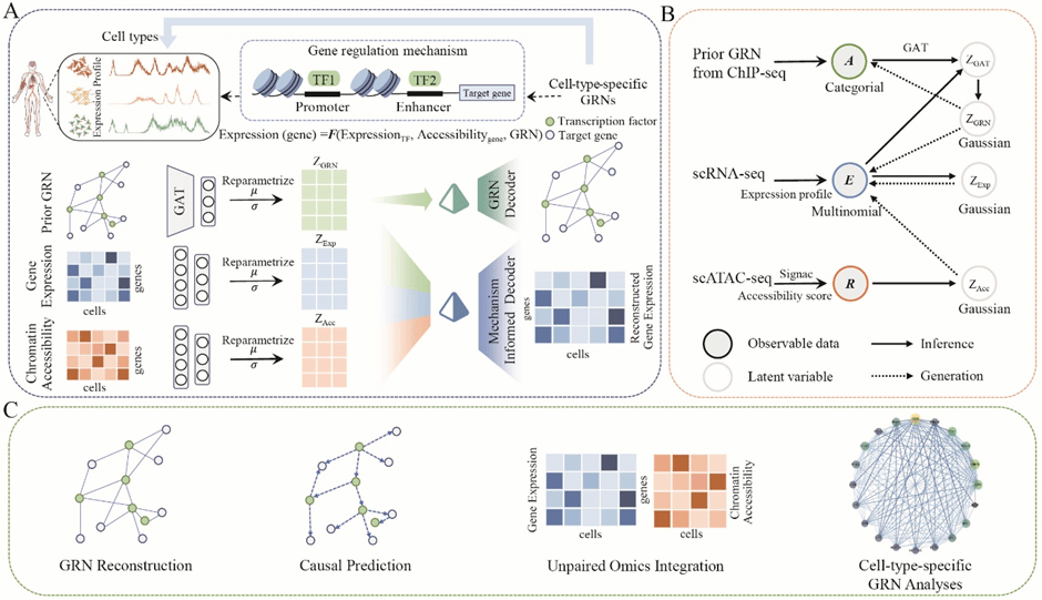基因调控网络刻画了转录因子通过染色质调控和转录调控共同决定基因表达的过程,是理解细胞功能和疾病机制的关键。然而,现有单细胞调控网络推断方法多依赖统计相关性,缺少生物机制引导的调控推断,难以区分真正的因果调控关系。因此,王颖教授团队提出了 PRISM-GRN,一种基于生物调控机制的单细胞多组学因果基因调控网络推断方法。该框架从转录调控的生物学过程出发,在统一的概率模型中显式刻画“染色质可及性影响转录因子结合,进而调控基因表达”的因果链条,将单细胞转录组和染色质可及性数据有机融合,从机制层面约束调控推断和因果关系。