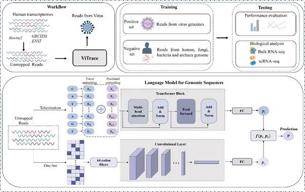 病毒感染与肿瘤发生发展密切相关,全球约 15% 的癌症病例被认为与病毒有关。然而,在肿瘤 RNA 测序数据中,病毒序列往往高度突变、种类未知且丰度极低,传统依赖序列比对和参考数据库的方法在检测未知或远缘病毒时面临显著局限,严重制约了肿瘤相关病毒的系统性研究。针对这一难题,研究团队提出 ViTrace 模型,将Transformer 语言模型与密码子级卷积神经网络相结合,在无需依赖完整参考数据库的情况下,自动学习病毒在核酸和编码层面的内在特征。