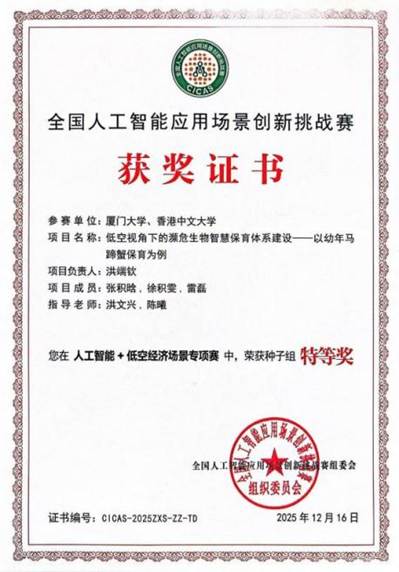 12月16日,2025第三届全国人工智能应用场景创新挑战赛人工智能+低空经济(文昌)专项晋级赛暨空天海AI+融合应用场景创新论坛在海南省文昌市举行。我系洪文兴教授与香港中文大学无人系统研究组联合指导的博士生洪端钦及其团队凭借《低空视角下的濒危生物智慧保育体系建设——以幼年马蹄蟹保育为例》项目脱颖而出,斩获本次专项赛种子组特等奖。该项目面向沿海生态保护的重大需求,针对马蹄蟹这一旗舰物种提出“多模态无人机集群+AI识别+大语言模型”融合的智能保护技术体系,该体系可实现潮间带大范围自主巡测、生态威胁识别、动态适宜性建模及保护策略闭环管理,为我国乃至全球马蹄蟹保育提供创新解决方案。