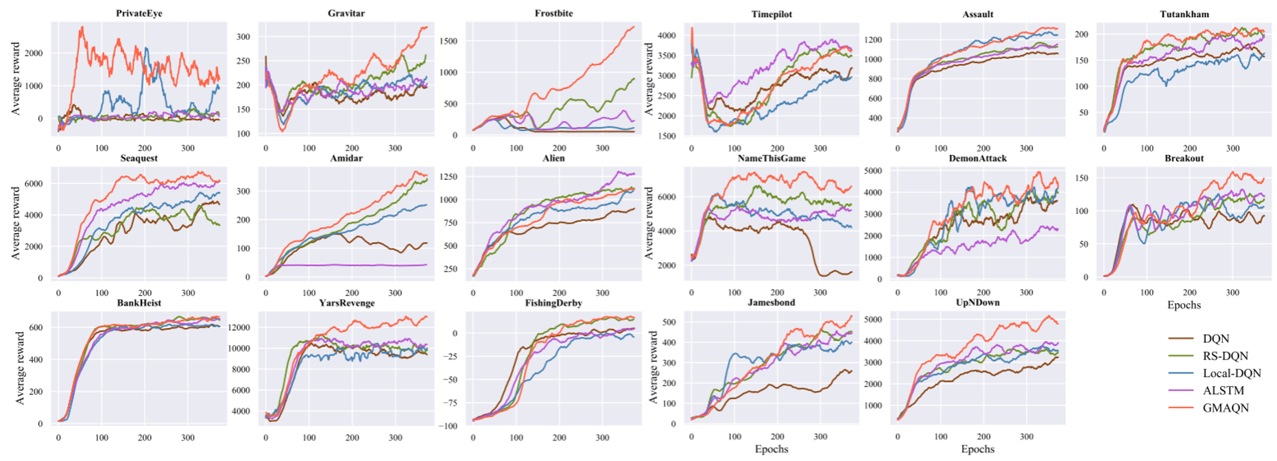 本文将提出的门控多注意力机制表征模块(GMA)扩展到DQN算法中,提出一种基于多注意力表征模块的Q学习框架(GMAQN)。在GMAQN框架训练期间,表征网络中的Gates机制分别对历史及输入注意力信息实现验证及筛选效果,进而消除历史冗余注意力,这可以缓解无关信息干扰智能体决策的问题。另外,Gates机制可以反向梯度诱导多注意力网络的分工训练,提升注意力学习效率。